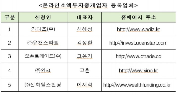 25일 금융위에 따르면 온라인소액투자중개업체로 등록된 업체는 5군데로 와디즈·오픈트레이드·인크·유캔스타트·신화웰스펀딩 등이다.