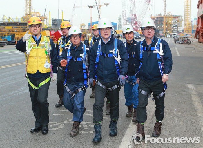 현대중공업 관계자는 “현대중공업과 협력회사는 함께 가야 하는 동반자로, 현재의 조선업 위기 상황을 협력회사와 함께 극복해나가기 위해 지속적으로 노력할 것”이라고 말했다.권오갑 현대중공업 사장(앞줄 오른쪽 두 번째)과 백형록 현대중공업 노조위원장(앞줄 오른쪽 세 번째)이 5일 오전, 함께 울산조선소의 해양플랜트 제작 현장을 둘러보고 있다. <사진제공=현대중공업>