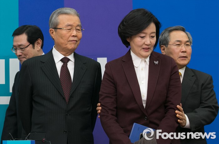 (서울=포커스뉴스) 25일 오전 서울 여의도 국회에서 열린 더불어민주당 1차 중앙선거대책위원회의에 참석한 우윤근(오른쪽) 선대위원이 박영선(가운데) 선대위원을 김종인 위원장 옆으로 안내하고 있다.