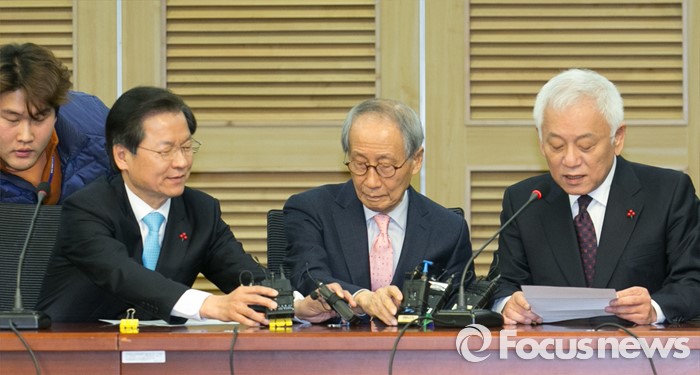 (서울=포커스뉴스) 25일 오전 서울 여의도 국회 의원회관에서 열린 국민의당-국민회의 통합발표 기자회견에 참석한 김한길(오른쪽부터) 국민의당 상임부위원장이 회견문을 낭독하자 윤여준(가운데) 공동창당준비위원장과 천정배 국민회의 창당준비위원장이 마이크를 옮겨주고 있다.