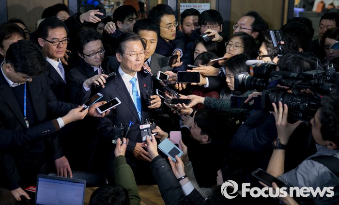 (서울=포커스뉴스) 25일 오전 서울 여의도 국회 의원회관에서 국민의당-국민회의 통합발표 기자회견을 마친 뒤 천정배 국민회의 창당준비위원장이 취재진 질문에 답하고 있다.