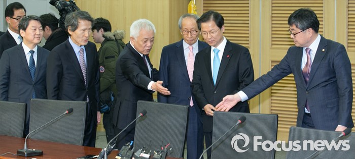 (서울=포커스뉴스) 25일 오전 서울 여의도 국회 의원회관에서 열린 국민의당-국민회의 통합발표 기자회견에 김한길 국민의당 상임부위원장과 최원식 대변인이 천정배 국민회의 창당준비위원장을 자리로 안내하고 있다. 왼쪽부터 안철수 국민의당 인재영입위원장, 한상진 공동창당준비위원장, 김한길 상임부위원장, 윤여준 공동창당준비위원장, 천정배 국민회의 창당준비위원장, 최원식 국민의당 대변인.