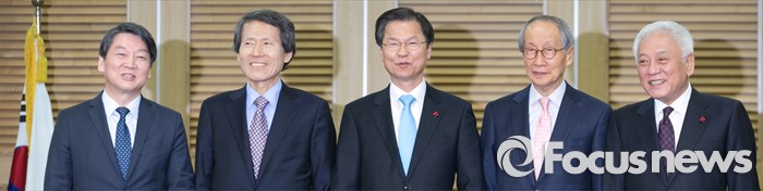 (서울=포커스뉴스) 25일 오전 서울 여의도 국회 의원회관에서 국민의당-국민회의 통합발표 기자회견을 마친 뒤 안철수(왼쪽부터) 국민의당 인재영입위원장, 한상진 공동창당준비위원장, 천정배 국민회의 창당준비위원장, 윤여준 국민의당 공동창당준비위원장, 김한길 상임부위원장이 취재진을 향해 포즈를 취하고 있다.