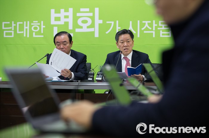 (서울=포커스뉴스)장병완 국민의당(가칭) 창당준비위원회 정책위의장과 주승용 원내대표(오른쪽)가 25일 오전 서울 마포구 국민의당 당사에서 전체 기조회의 결과 브리핑을 하고 있다.