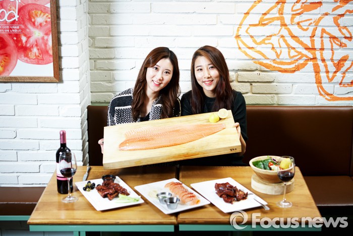 제철 샐러드&그릴 레스토랑 세븐스프링스는 지난해 10월 샐러드 바 가격을 20% 이상 낮췄다. 2001년 설립 이후 서울과 수도권을 비롯해 부산, 창원 등 전국 총 14개 매장을 운영하고 있다.홍보도우미들이 신메뉴 노르웨이 생연어를 들고 포즈를 취하고 있다. <사진제공=세븐스프링스>