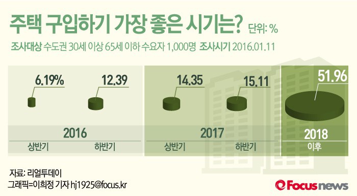 (서울=포커스뉴스) 25일 리얼투데이가 발표한 '2016년 주택시장 전망'에 따르면 주택 구입의 적정시기에 대해서 절반 이상인 51.96%(344명)이 2018년 이후가 적정하다고 답해 올해 주택 시장 전망은 대체로 부정적인 시각이 많았다.
