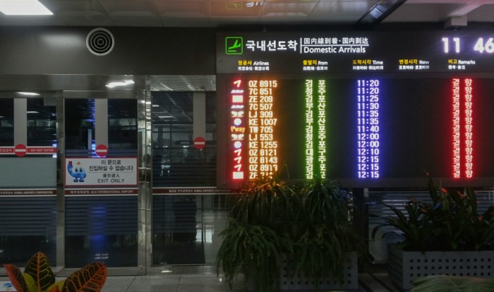 (서울=포커스뉴스) 32년 만에 폭설로 제주국제공항이 폐쇄된지 3일째 되는 25일 오전 제주국제공항 대합실 안내판에 결항 표시가 되어 있다.