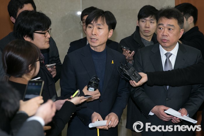 (서울=포커스뉴스) 김성수(오른쪽) 더불어민주당 대변인과 한창민 정의당 대변인이 25일 오후 서울 여의도 국회 정론관에서 문재인 더불어민주당 대표와 심상정 정의당 상임대표 회동 결과에 대한 브리핑을 마친 뒤 취재진 질문에 답하고 있다. 이날 문 대표와 심 대표는 20대 총선에 대비한 사실상 연대방침을 확인했다.