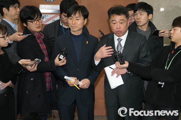 (서울=포커스뉴스) 김성수(오른쪽) 더불어민주당 대변인과 한창민 정의당 대변인이 25일 오후 서울 여의도 국회 정론관에서 문재인 더불어민주당 대표와 심상정 정의당 상임대표 회동 결과에 대한 브리핑을 마친 뒤 취재진 질문에 답하고 있다. 이날 문 대표와 심 대표는 20대 총선에 대비한 사실상 연대방침을 확인했다.