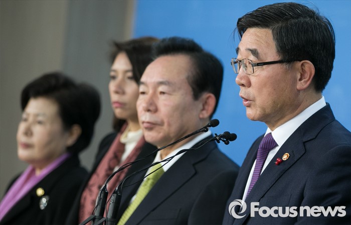 (서울=포커스뉴스) 이기권 고용노동부 장관과 이인제 새누리당 노동선진화특위원장 등 의원들이 25일 오후 서울 여의도 국회 정론관에서 노동개혁 2대 지침(일반해고 지침, 취업규칙 지침) 설명회를 마친 뒤 브리핑을 하고 있다.
