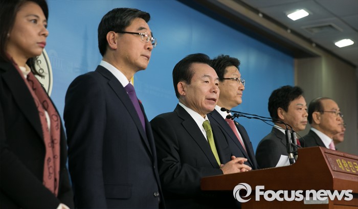 (서울=포커스뉴스) 이기권 고용노동부 장관과 이인제 새누리당 노동선진화특위원장 등 의원들이 25일 오후 서울 여의도 국회 정론관에서 노동개혁 2대 지침(일반해고 지침, 취업규칙 지침) 설명회를 마친 뒤 브리핑을 하고 있다.