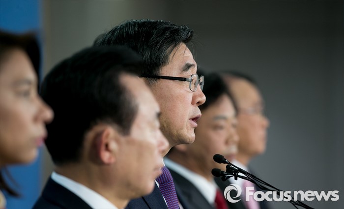 (서울=포커스뉴스) 이기권 고용노동부 장관과 이인제 새누리당 노동선진화특위원장 등 의원들이 25일 오후 서울 여의도 국회 정론관에서 노동개혁 2대 지침(일반해고 지침, 취업규칙 지침) 설명회를 마친 뒤 브리핑을 하고 있다.