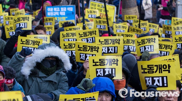 (서울=포커스뉴스) 25일 오후 서울 중구 지방고용노동청 앞에서 열린 '민주노총 수도권 총파업 결의대회'에 참가한 노조원이 구호를 외치고 있다.