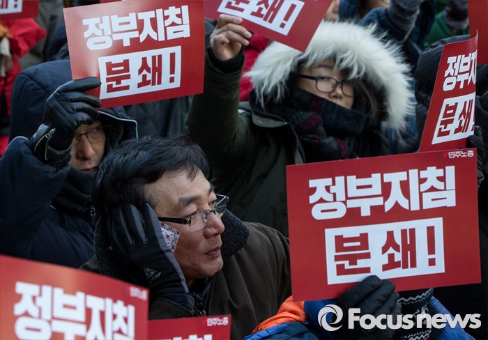 (서울=포커스뉴스) 25일 오후 서울 중구 지방고용노동청 앞에서 열린 '민주노총 수도권 총파업 결의대회'에 참가한 노조원이 정부지침 분쇄가적힌 손팻말을 들고 있다.
