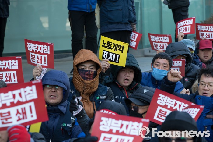 (서울=포커스뉴스) 25일 오후 서울 중구 지방고용노동청 앞에서 열린 '민주노총 수도권 총파업 결의대회'에 참가한 노조원이 구호를 외치고 있다.
