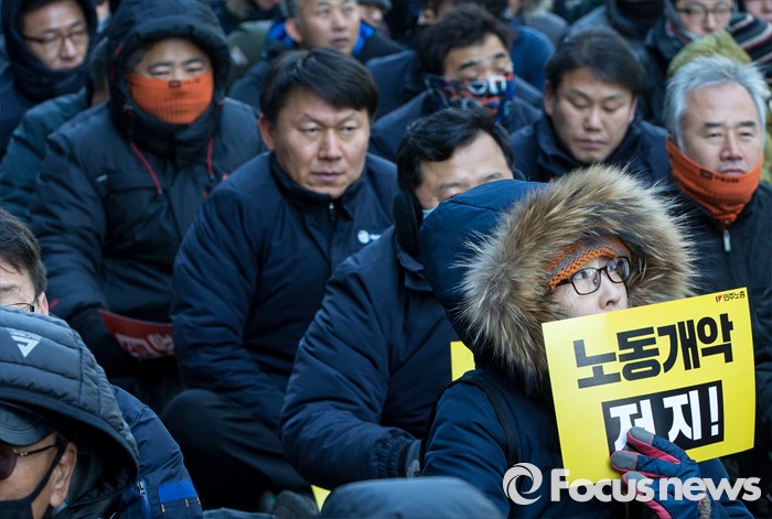 (서울=포커스뉴스) 25일 오후 서울 중구 지방고용노동청 앞에서 열린 '민주노총 수도권 총파업 결의대회'에 참가한 노조원이 노동개악 저지가 적힌 손팻말을 들고 있다.