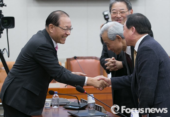 (서울=포커스뉴스) 25일 오후 서울 여의도 국회에서 열린 산업통상자원위원회 전체회의에 앞서 황우여(왼쪽) 새누리당 의원과 동료 의원들이 인사하고 있다.