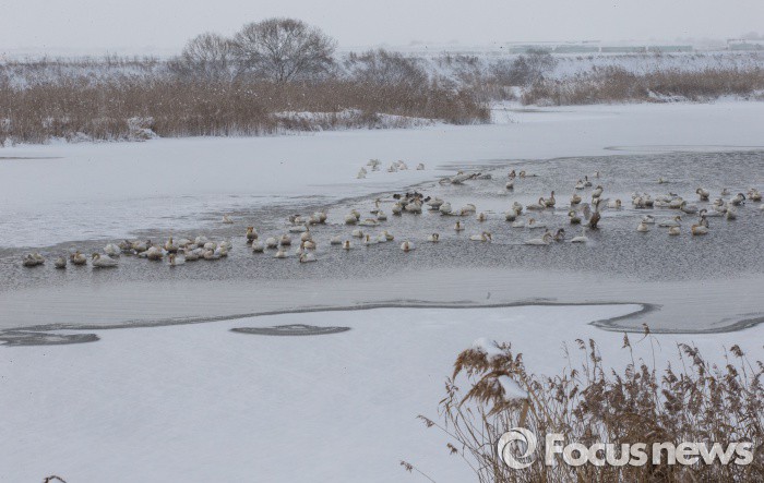 (서산=포커스뉴스) 눈발이 내리고 있는 26일충남 서산시 천수만 해미천이 대부분 꽁꽁 얼어붙고, 일부 지역에만 녹아 있자, 겨울진객 큰고니(천연기념물201호)들이 옹기종기 모여 추위를 피하고 있다. 기상청은 오늘 낮부터 한파가 물러나고 평년기온을 되찾겠다고 예보하고 있다.
