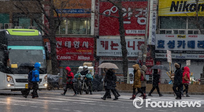 (서울=포커스뉴스) 서울 지역에 눈이 내리고 있는 26일 오전 서울 중구 남대문 일대에서 직장인들이 내리는 눈을 맞으며 출근길을 재촉 하고 있다.