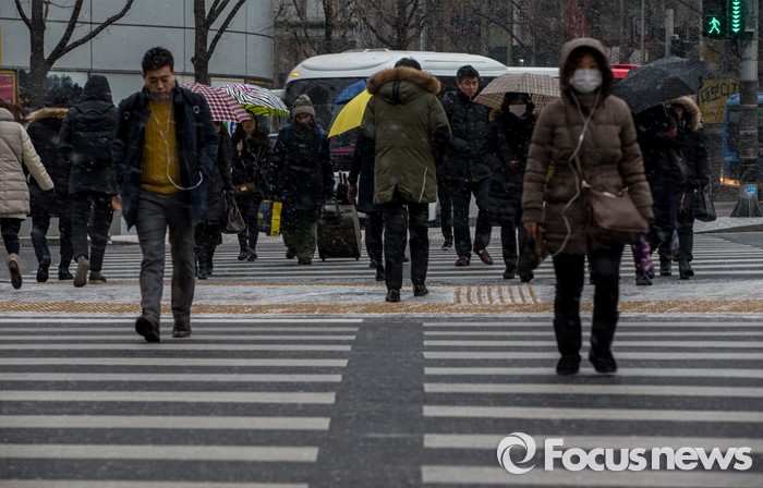 (서울=포커스뉴스) 서울 지역에 눈이 내리고 있는 26일 오전 서울 중구 남대문 일대에서 직장인들이 내리는 눈을 맞으며 출근길을 재촉 하고 있다.