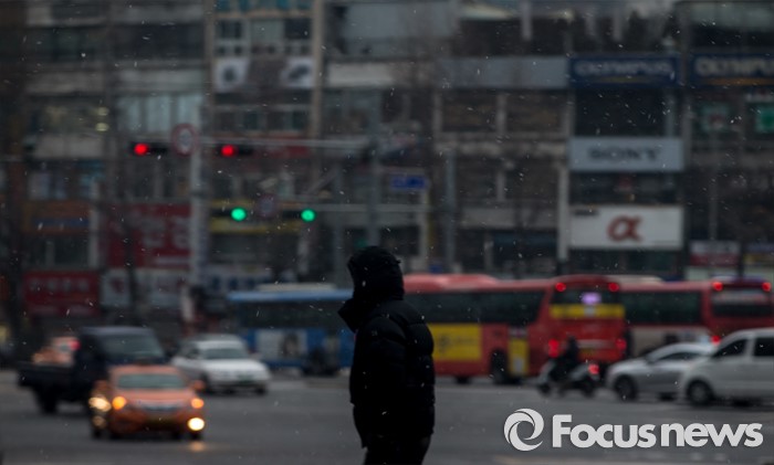 (서울=포커스뉴스) 서울 지역에 눈이 내리고 있는 26일 오전 서울 중구 남대문 일대에서 직장인들이 내리는 눈을 맞으며 출근길을 재촉 하고 있다.