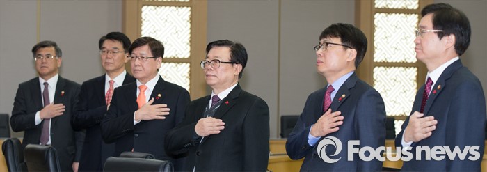 (세종=포커스뉴스) 26일 오전 세종시 정부세종청사 국무회의장에서 열린 서울-세종 영상 국무회의에서 세종청사에 참석한 국무위원들이 국기에 대한 경례를 하고 있다.