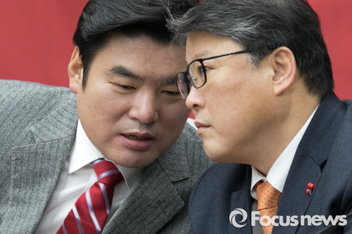(서울=포커스뉴스) 원유철(왼쪽) 새누리당 원내대표와 조원진 원내수석부대표가 26일 오전 서울 여의도 국회에서 열린 원내대책회의에 참석해 대화하고 있다.