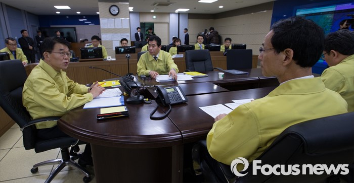 (세종=포커스뉴스) 26일 오전 세종시 정부세종청사 국토교통부 제주공항체류여객 비상수송대책본부에서 관계자들이 제주도 인근 운항상황을 점검하고 있다.