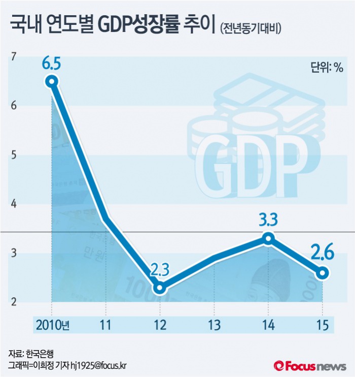 (서울=포커스뉴스) 한국은행이 26일 발표한 ‘2015년 4분기 및 연간 국내총생산’에 따르면 2015년 연간 실질 국내총생산(GDP)은 전년대비 2.6%에 불과했다. 이는 지난 2012년 2.3% 이후 가장 낮은 수치를 기록했다.