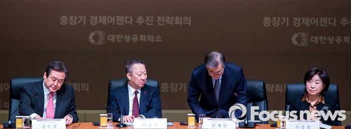 (서울=포커스뉴스) 문재인 더불어민주당 대표가 26일 오전 서울 중구 대한상공회의소 국제회의장에서 열린 '중장기 경제어젠다 추진 전략회의'에 자리해 축사에 앞서 인사하고 있다. 이날 회의에 자리한 여야정 대표 및 산학연 대표 70여명은 규제 근본 틀 개선, 기업문화 개선, 국민 행복 위한 서비스 발전 등을 논의 할 예정이다.