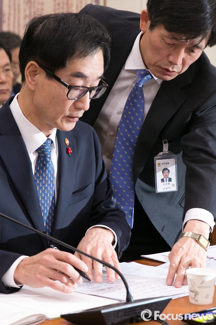(서울=포커스뉴스) 이준식(왼쪽) 사회부총리 겸 교육부 장관이 26일 오전 서울 여의도 국회에서 열린 교육문화체육관광위원회 전체회의에 출석해, 직원과 논의하고 있다. 이날 국회 교문위 전체회의는 교육부로부터 누리과정과 아동학대 현황을 보고받고 대책을 논의한다.