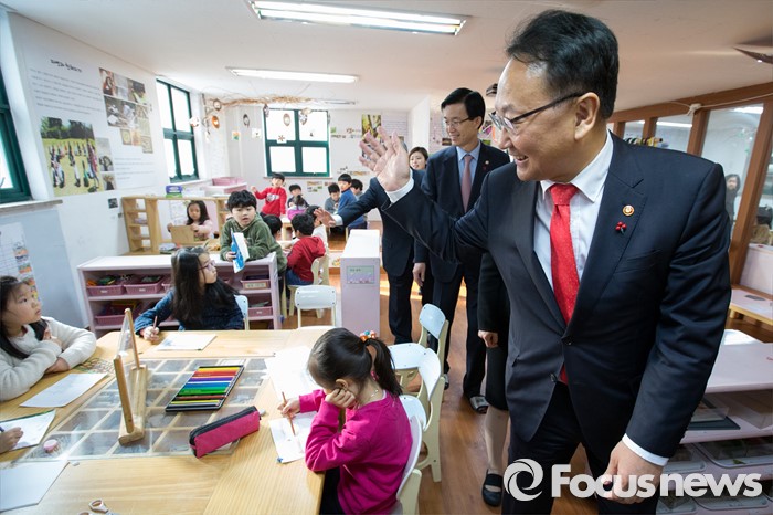 (서울=포커스뉴스) 누리과정 관련 현장을 방문한 유일호 경제부총리 겸 기획재정부 장관이 26일 오전 서울 강서구 보라유치원에 방문해 아이들에게 인사하고 있다.