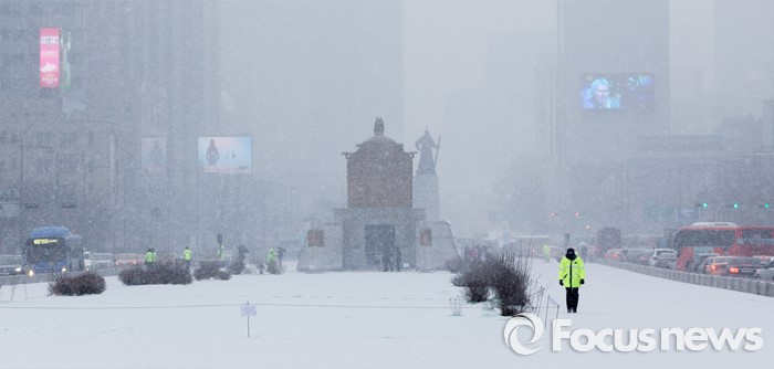 (서울=포커스뉴스) 서울을 비롯한 중부지역 곳곳에 눈이 내린 26일 오전 서울 광화문광장에 하얗게 눈이 쌓이고 있다.