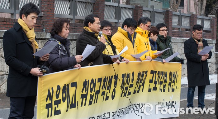 (대전=포커스뉴스) 26일 오전 대전 서구 대전지방고용노동청 앞에서 정의당 대전시당원들이 기자회견을 열고 쉬운해고 취업규칙 변경 및 정부지침 철회를 촉구하고 있다.