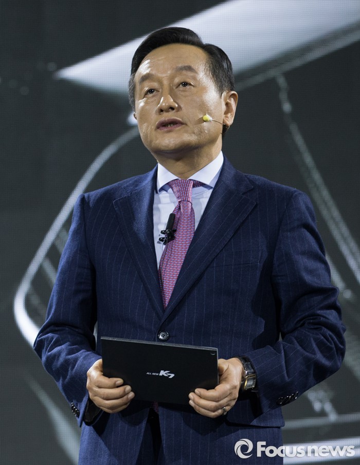 (서울=포커스뉴스) 26일 오전 서울 강남구 그랜드 인터컨티넨탈 서울 파르타스에서 열린 '기아차 올 뉴 K7 신차발표회'에서 김창식 기아차 국내영업본부장(부사장)이 발표를 하고 있다.