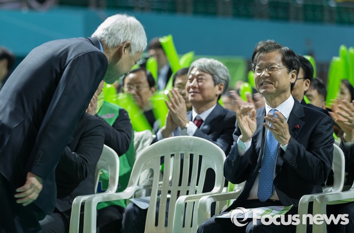 (전주=포커스뉴스) 26일 오전 전주시 완산구 화산체육관에서 열린 전북도당 창당대회에서 김한길 의원이 당원들의 환호에 인사하고 있다. 오른쪽은 천정배 의원.