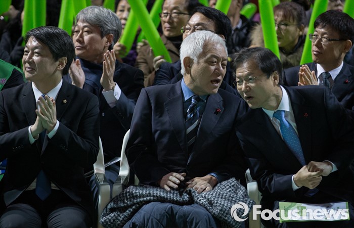 (전주=포커스뉴스) 국민의당 김한길 의원이 26일 오전 전주시 완산구 화산체육관에서 열린 전북도당 창당대회에서 국민의당과 통합을 선언한 천정배 의원에게 귀엣말을 하고 있다. 왼쪽부터 안철수, 김한길, 천정배 의원.