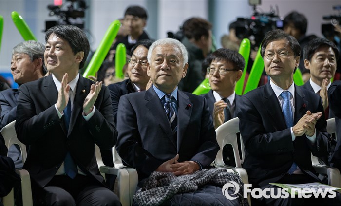 (전주=포커스뉴스) 국민의당 안철수 의원과 국민의당과 통합 선언을 한 천정배 의원이 26일 오전 전주시 완산구 화산체육관에서 열린 전북도당 창당대회에 참석하고 있다. 왼쪽부터 안철수, 김한길, 천정배 의원.