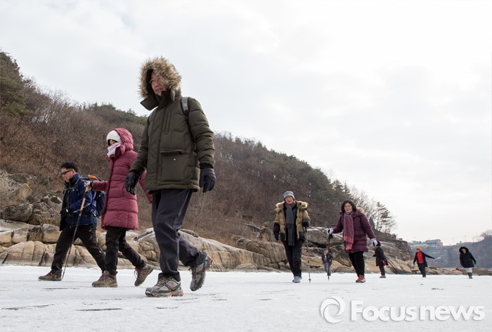 (철원=포커스뉴스) 26일 오전 강원 철원군 한탄강 일대에서 여행객들이 얼음트래킹을 즐기고 있다.