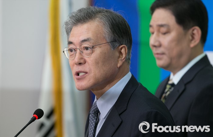 (서울=포커스뉴스) 문재인(왼쪽) 더불어민주당 대표가 26일 오후 서울 여의도 국회에서 열린 김병기 전 국가정보원 인사처장 인재영입 기자회견에 참석해 인사말을 하고 있다.