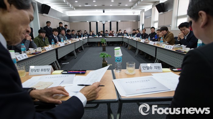 (전주=포커스뉴스) 국민의당 안철수 의원과 한상진 공동 창준위원장이 26일 오후 전주시 완산구 전주정보문화산업진흥원 IT벤처센터에서 벤처기업 종사자들과 함께하는 도시락 간담회를 갖고 있다.