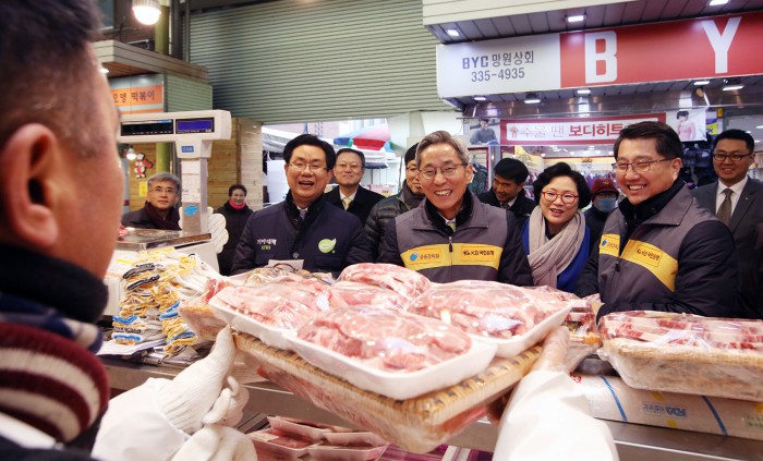 (서울=포커스뉴스) 진웅섭 금융감독원장과 윤종규 KB금융지주 회장 겸 국민은행장이 설 명절을 앞두고 전통시장을 방문했다.