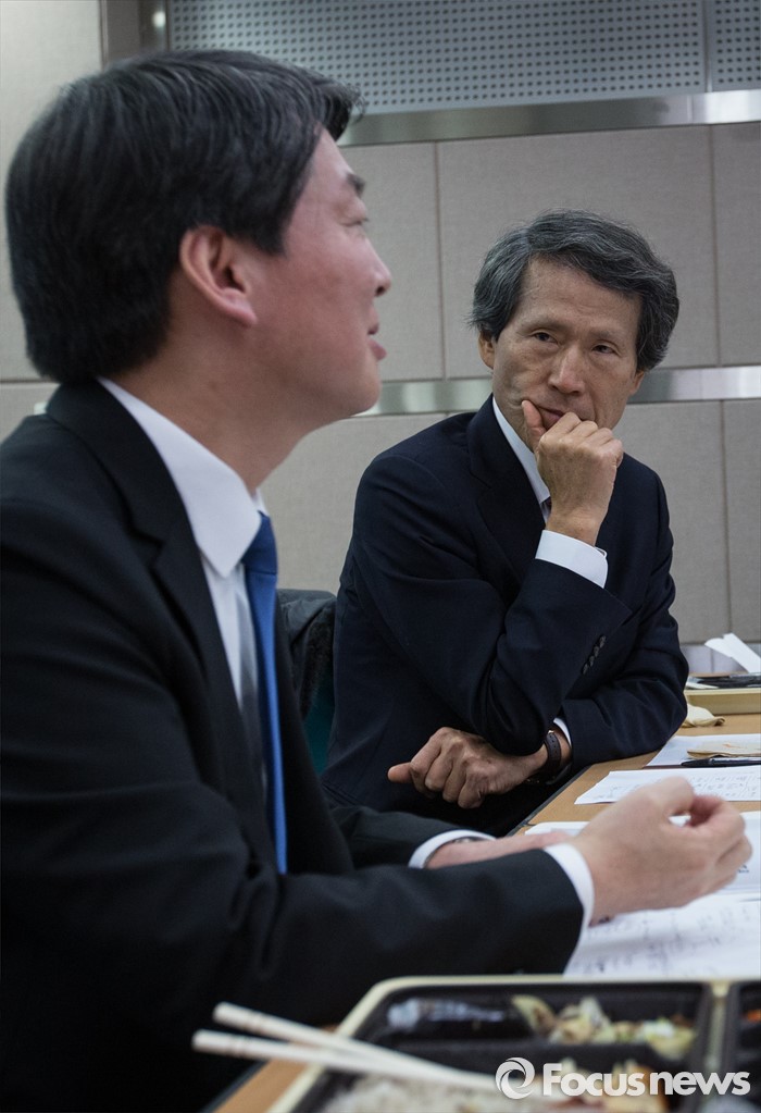 (전주=포커스뉴스) 국민의당 한상진 공동 창준위원장이 26일 오후 전주시 완산구 전주정보문화산업진흥원 IT벤처센터에서 열린벤처기업 종사자들과 함께하는 도시락 간담회에서 안철수 의원을 바라보고 있다.