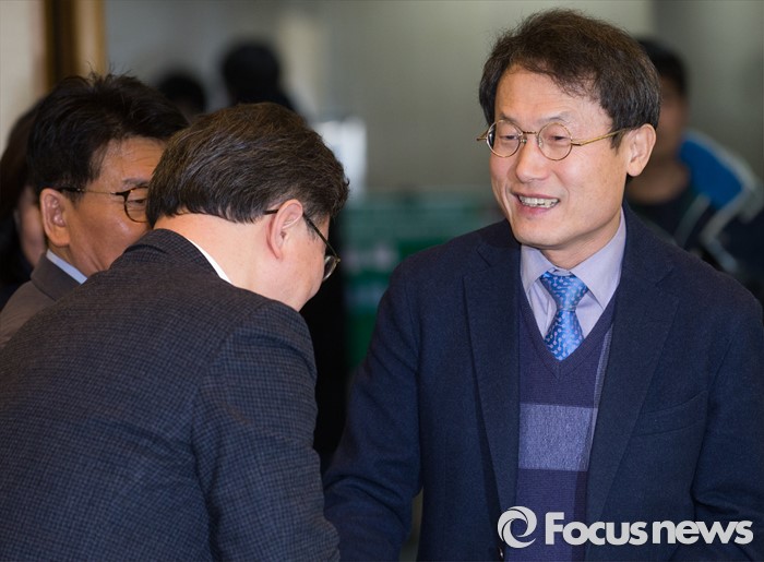 (서울=포커스뉴스) 26일 오후 서울 중구 한국프레스센터에서 열린 '1.26 서울 학생 인권의 날 선포식'에 참석한 조희연(오른쪽) 서울시 교육감이 참석자들과 인사를 나누고 있다.