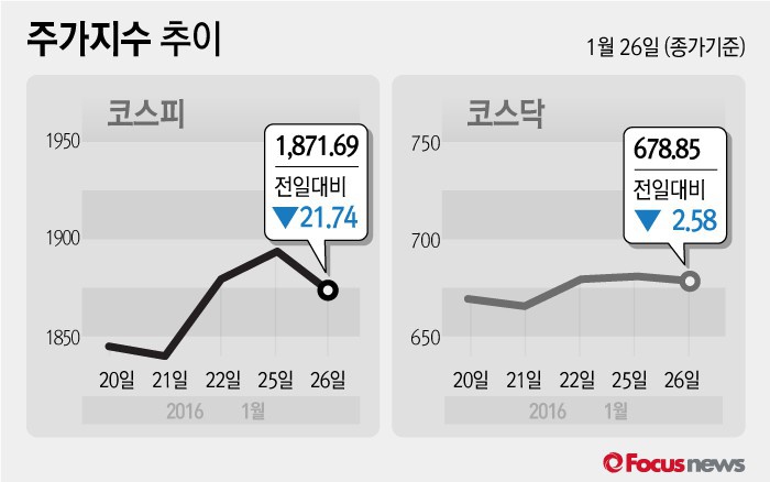 (서울=포커스뉴스) 26일 코스피지수는 전날 보다 1.15%(21.74포인트) 내린 1871.69에 장을 마쳤다. 코스닥지수는 전일 대비 0.38%(2.58포인트) 내린 678.85에 마감했다.