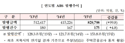 금감원은 “2015년 ABS 시장은 금융회사와 기업에게 중요한 자금조달 시장으로서의 역할을 충실히 수행하여 왔다”며 “국내·외 불안요인으로 회사채 시장이 경색되고 있는 올해 ABS 시장의 역할이 더욱 중요해 질 것으로 예상된다”고 강조했다.