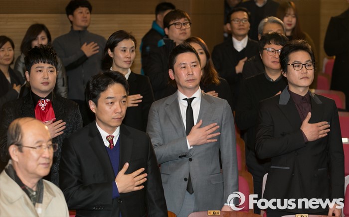 (서울=포커스뉴스) 26일 오후 서울 여의도 국회 의원회관에서 열린 15회 대한민국 국회대상 시상식에 방송진행 부문 대상을 수상하는 방송인 신동엽(가운데)과 콘텐츠드라마 케이블부문 대상을 수상하는 '응답하라 1988'의 배우 김성균(오른쪽), 전통가요저변확대상을 수상하는 가수 박현빈 등 참석자들이 국기에 대한 경례를 하고 있다.