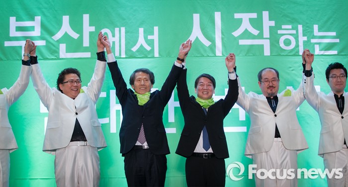 | △ 국민의당 '부산시당 창당대회', 당원들 환호에 답하는 안철수와 한상진 |