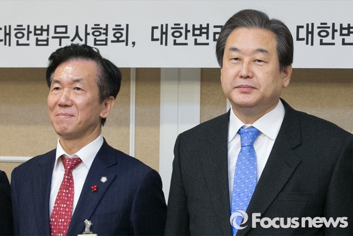 (서울=포커스뉴스) 김무성(오른쪽) 새누리당 대표가 27일 오전 서울 여의도 국회 귀빈식당에서 비공개로 진행된 법조전문자격사포럼 조찬 간담회에 참석해, 본격적인 포럼 전 하창우(왼쪽) 대한변호사협회 회장을 비롯한 각 단체 대표들과 기념사진을 찍고있다.
