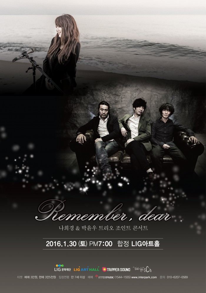 나희경과 박윤우 트리오의 조인트 콘서트 '리멤버, 디어' 예매는 인터파크를 통해 진행 중이다.싱어송라이터 나희경과 재즈기타리스트 박윤우 트리오의 조인트 콘서트 'Remember, dear'가 오는 30일 합정 LIG아트홀에서 열린다.<사진제공=트리퍼 사운드>